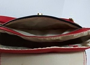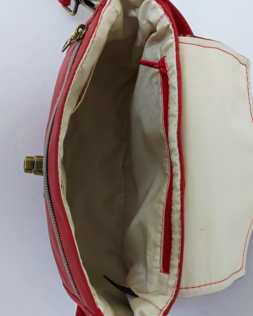Red vinyl exterior with patterned vinyl accent. Antique brass hardware.